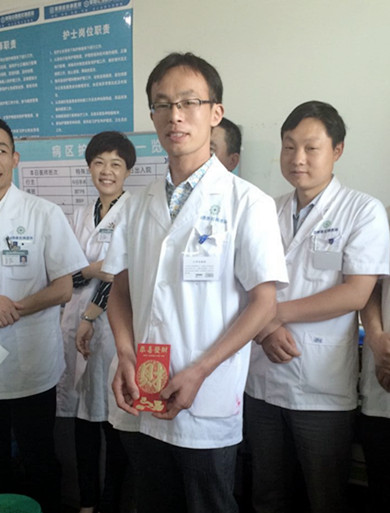 在阜阳兆岐肛肠医院例会上财务部向周伟医生送上300元的奖励